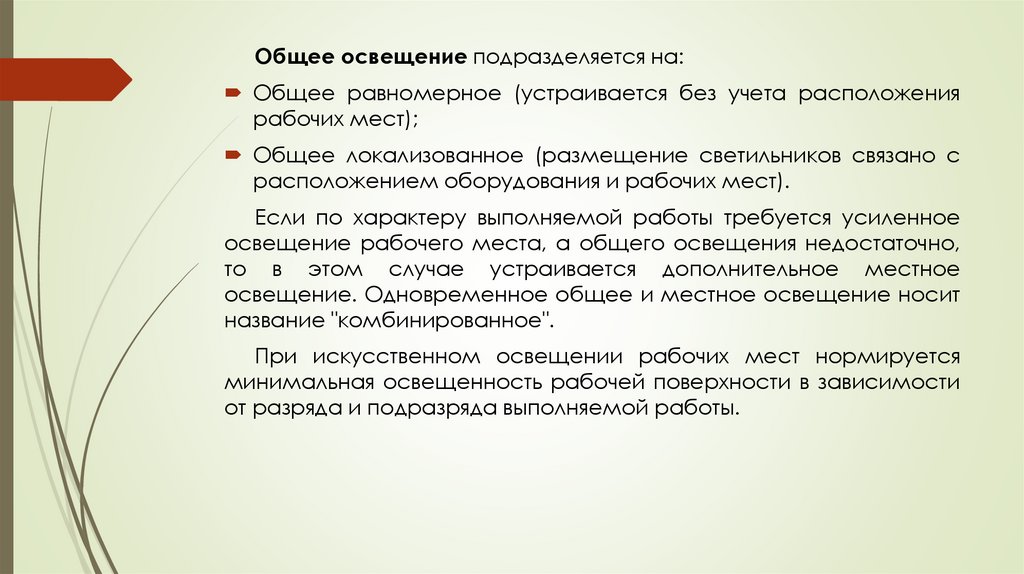 Общее освещение подразделяется на:Общее равномерное (устраивается без учета расположения
