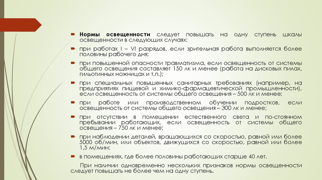 Нормы освещенности следует повышатьосвещенности в следующих случаях: