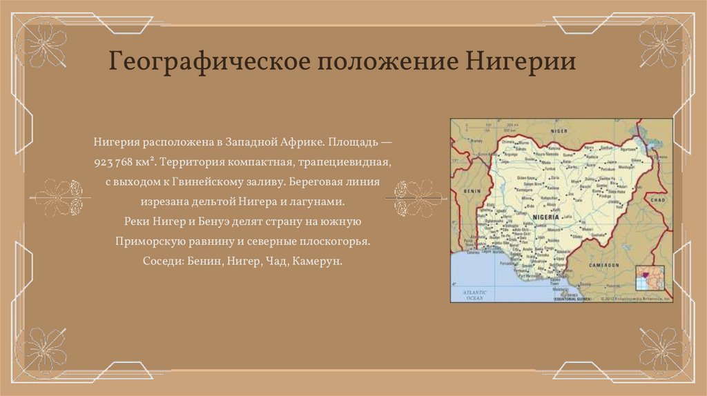 Географическое положение НигерииНигерия расположена в Западной Африке. Площадь —