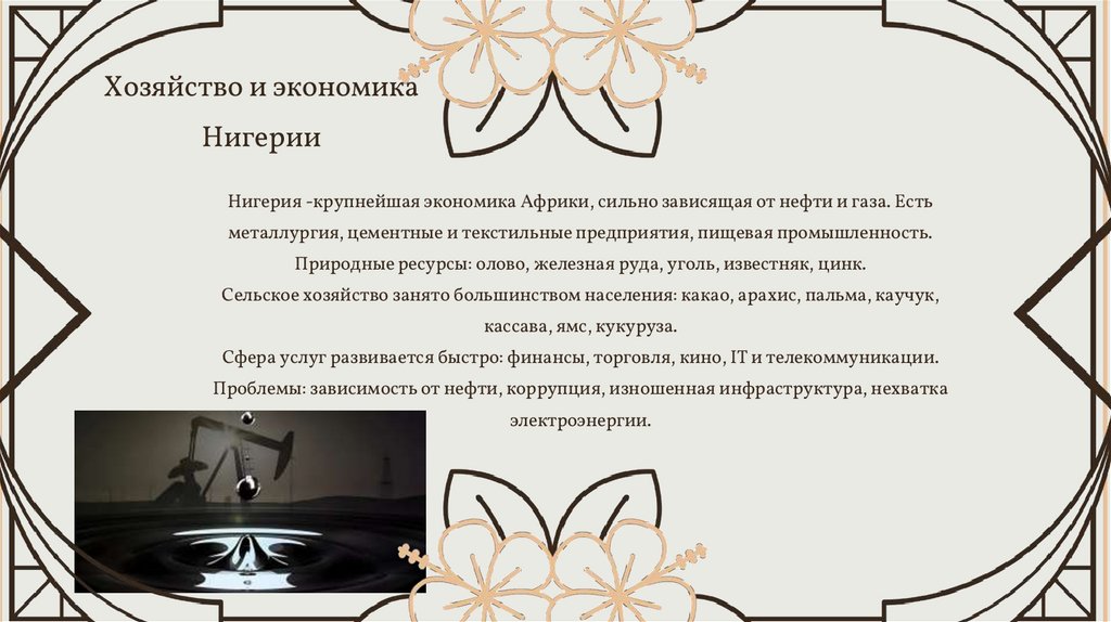 Нигерия -крупнейшая экономика Африки, сильно зависящая от нефти и газа. Есть