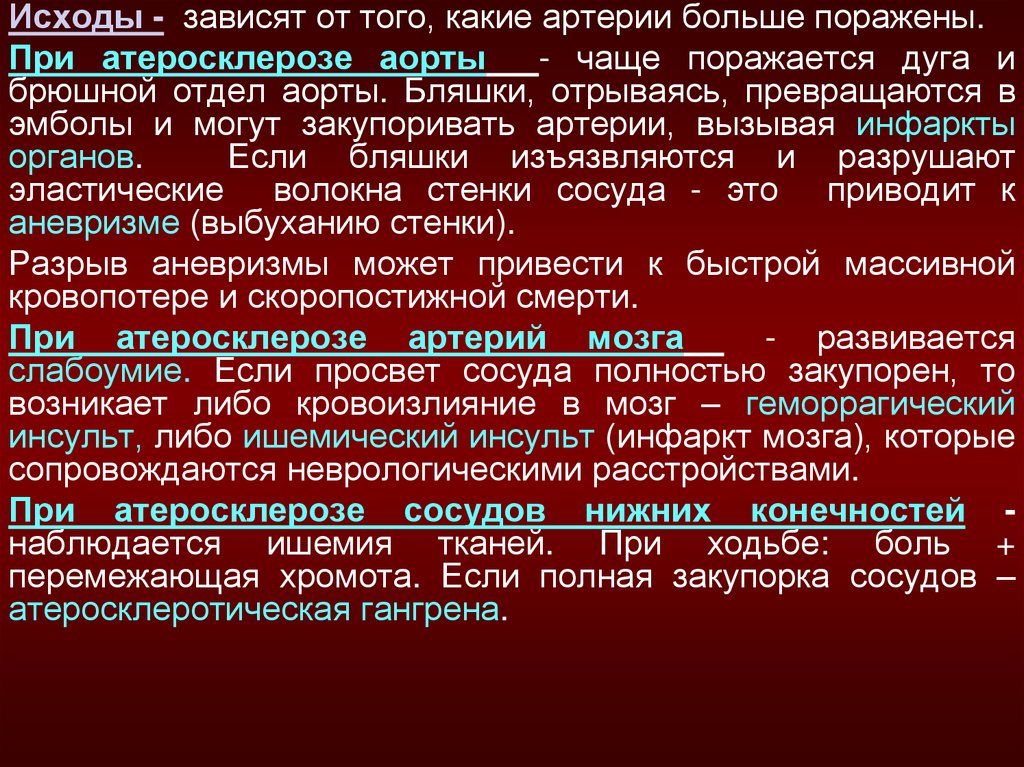 Исходы - зависят от того, какие артерии больше поражены.При атеросклерозе аорты