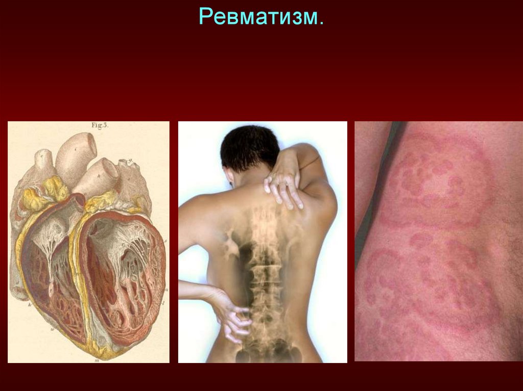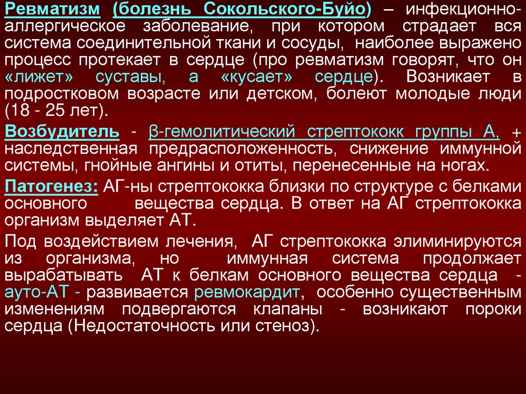 Ревматизм (болезнь Сокольского-Буйо) – инфекционноаллергическое заболевание, при котором страдает всясистема соединительной ткани и сосуды, наиболее выражено