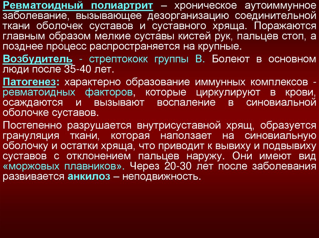 Патогенез: характерно образование иммунных комплексов ревматоидных факторов, которые циркулируют в крови,