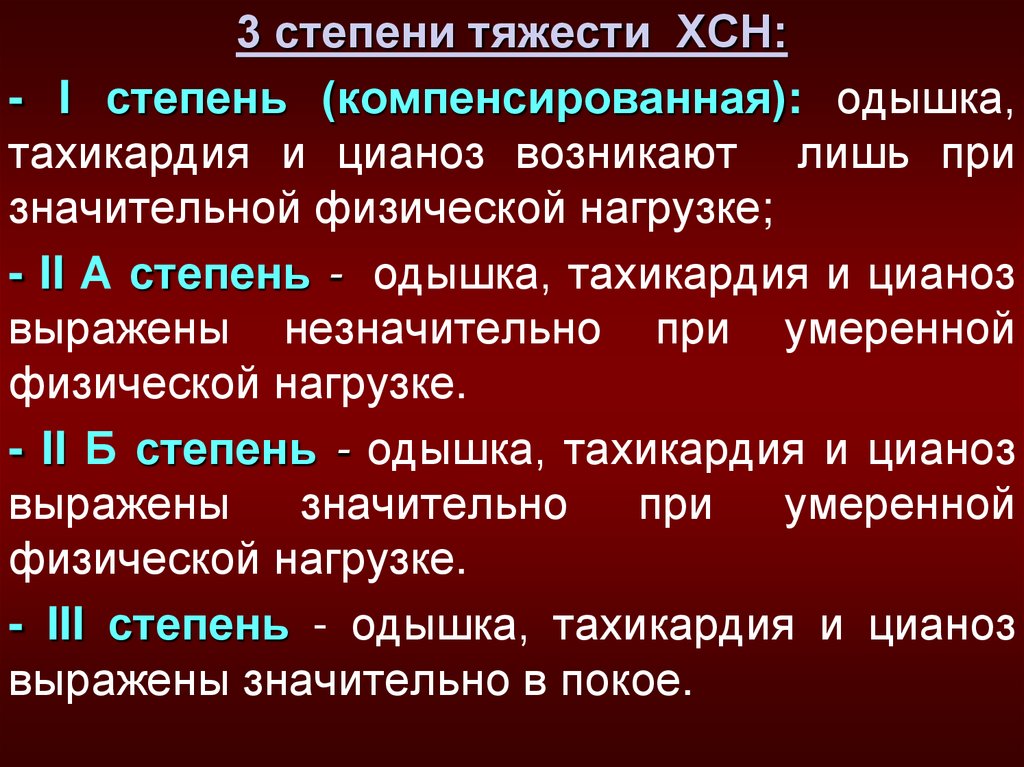 3 степени тяжести ХСН:- I степень (компенсированная): одышка,
