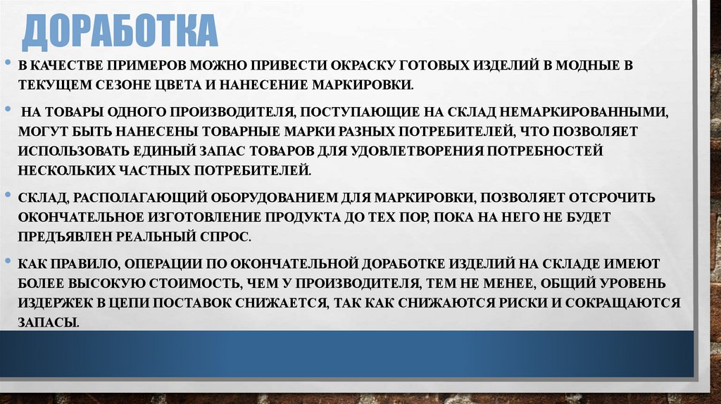 • КАК ПРАВИЛО, ОПЕРАЦИИ ПО ОКОНЧАТЕЛЬНОЙ ДОРАБОТКЕ ИЗДЕЛИЙ НА СКЛАДЕ ИМЕЮТ