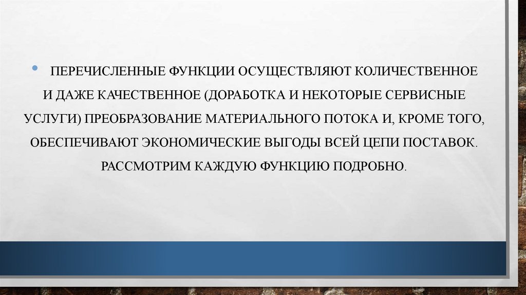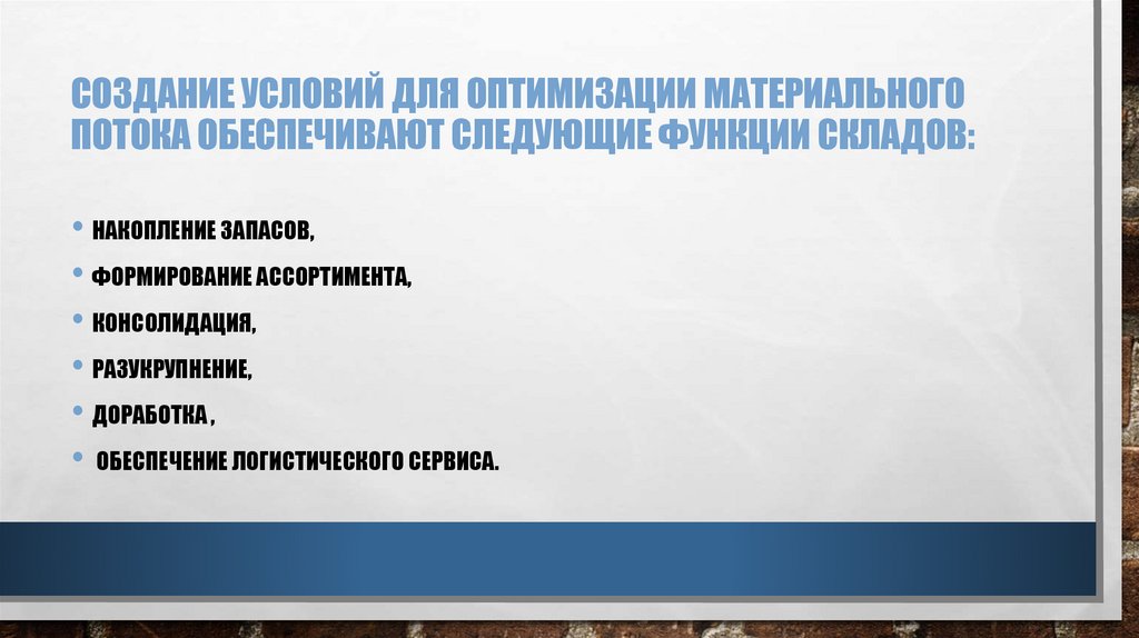 СОЗДАНИЕ УСЛОВИЙ ДЛЯ ОПТИМИЗАЦИИ МАТЕРИАЛЬНОГОПОТОКА ОБЕСПЕЧИВАЮТ СЛЕДУЮЩИЕ ФУНКЦИИ СКЛАДОВ: