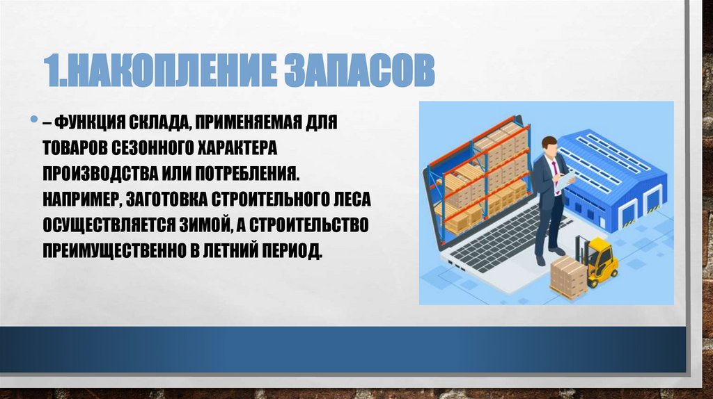 1.НАКОПЛЕНИЕ ЗАПАСОВ• – ФУНКЦИЯ СКЛАДА, ПРИМЕНЯЕМАЯ ДЛЯ