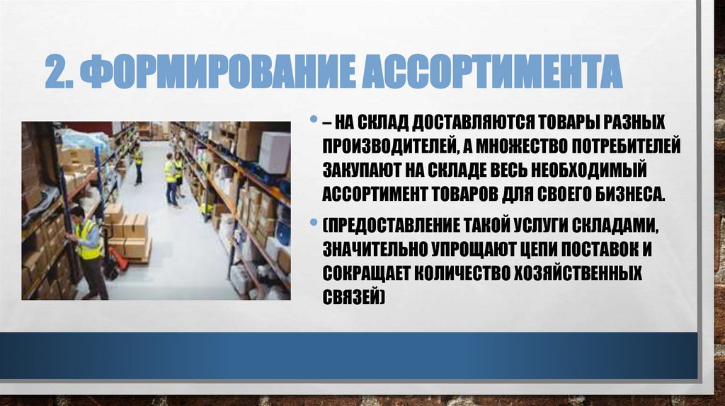 2. ФОРМИРОВАНИЕ АССОРТИМЕНТА• – НА СКЛАД ДОСТАВЛЯЮТСЯ ТОВАРЫ РАЗНЫХ