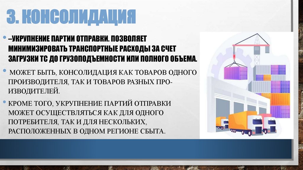 3. КОНСОЛИДАЦИЯ• –УКРУПНЕНИЕ ПАРТИИ ОТПРАВКИ. ПОЗВОЛЯЕТ