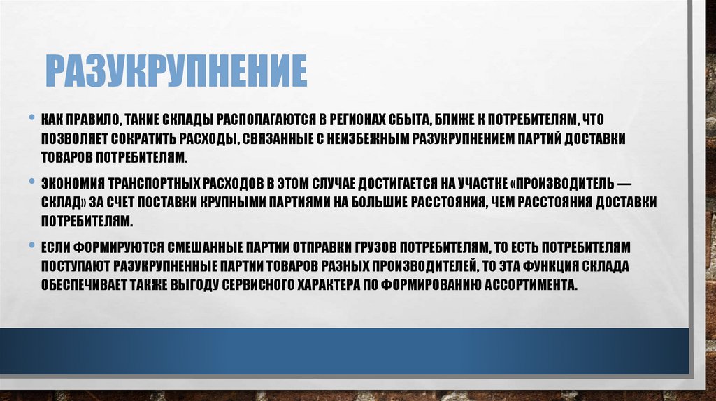 РАЗУКРУПНЕНИЕ• КАК ПРАВИЛО, ТАКИЕ СКЛАДЫ РАСПОЛАГАЮТСЯ В РЕГИОНАХ СБЫТА, БЛИЖЕ К ПОТРЕБИТЕЛЯМ, ЧТО