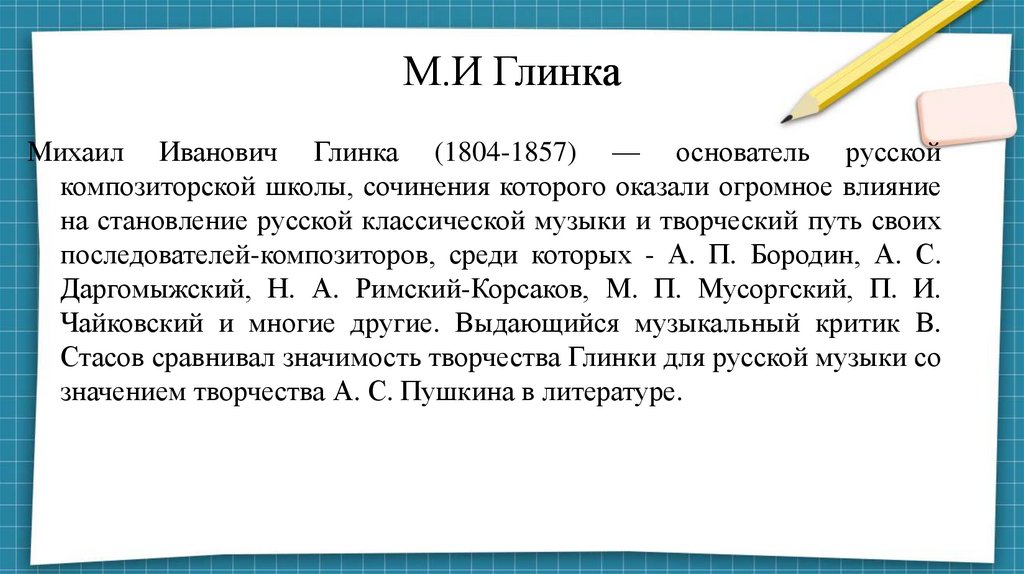 Михаил Иванович Глинка (1804-1857) — основатель русскойкомпозиторской школы, сочинения которого оказали огромное влияние