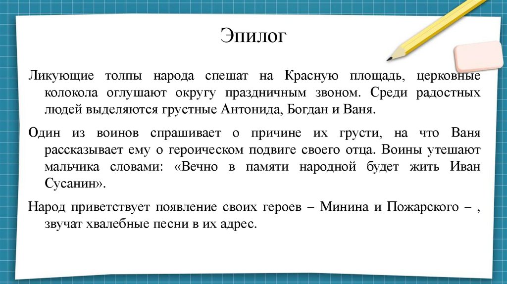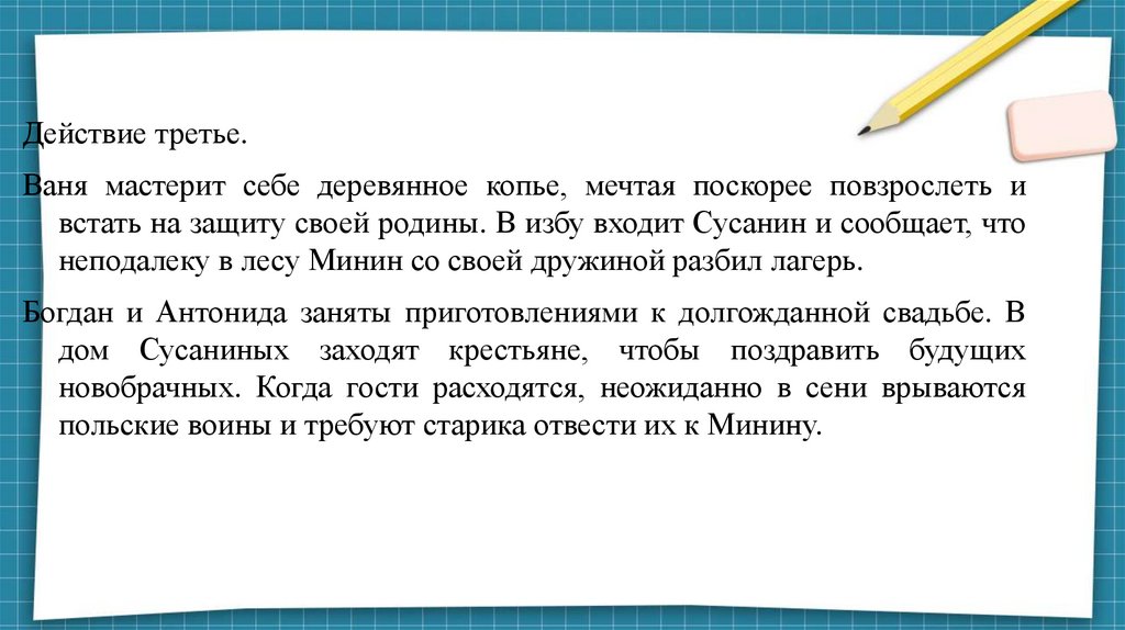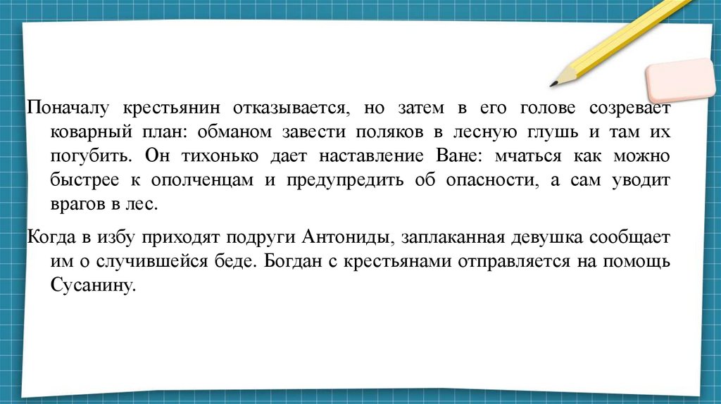 встать на защиту своей родины. В избу входит Сусанин и сообщает, что