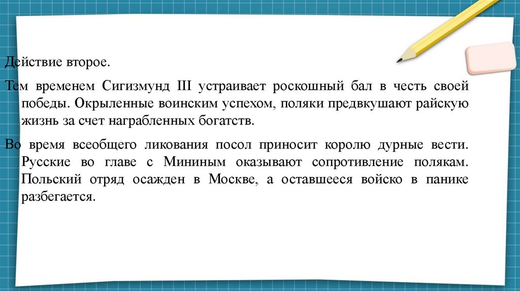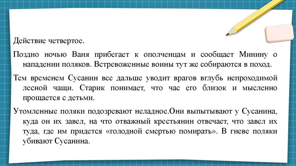 Действие четвертое.Поздно ночью Ваня прибегает к ополченцам и сообщает Минину о
