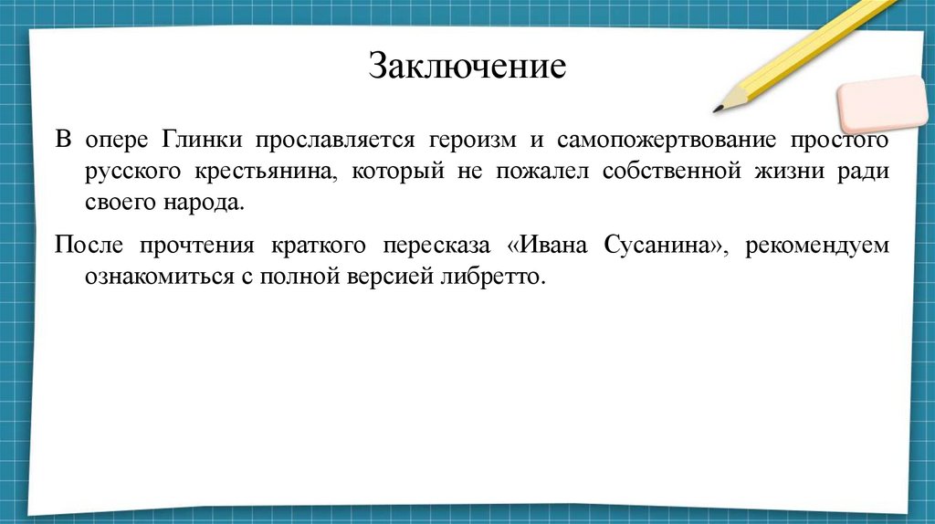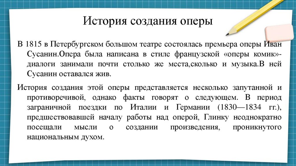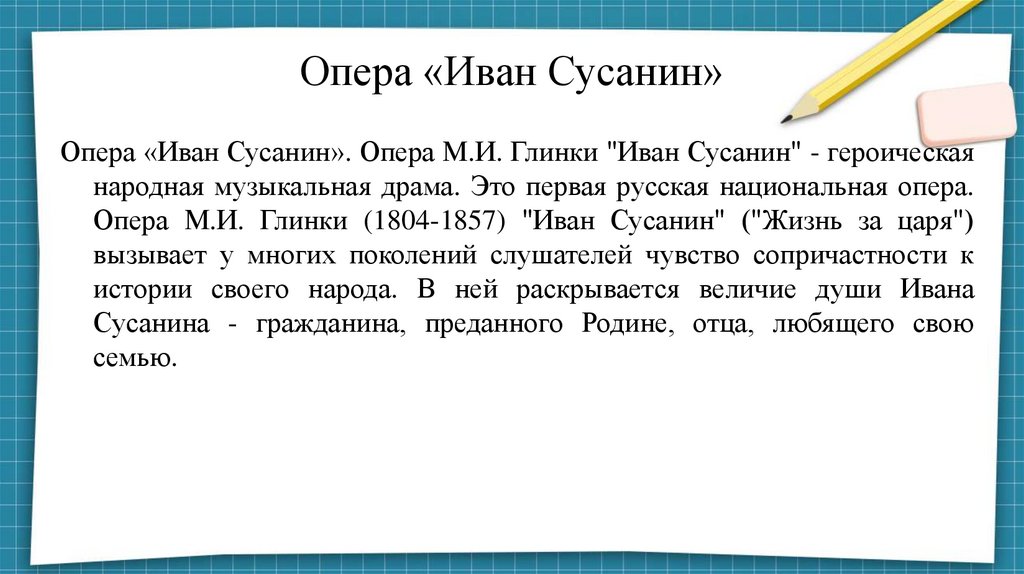 Опера «Иван Сусанин». Опера М.И. Глинки "Иван Сусанин" - героическаянародная музыкальная драма. Это первая русская национальная опера.