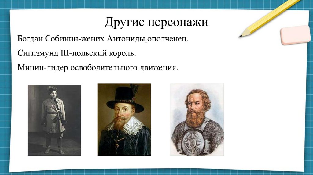 Богдан Собинин-жених Антониды,ополченец.Сигизмунд III-польский король.