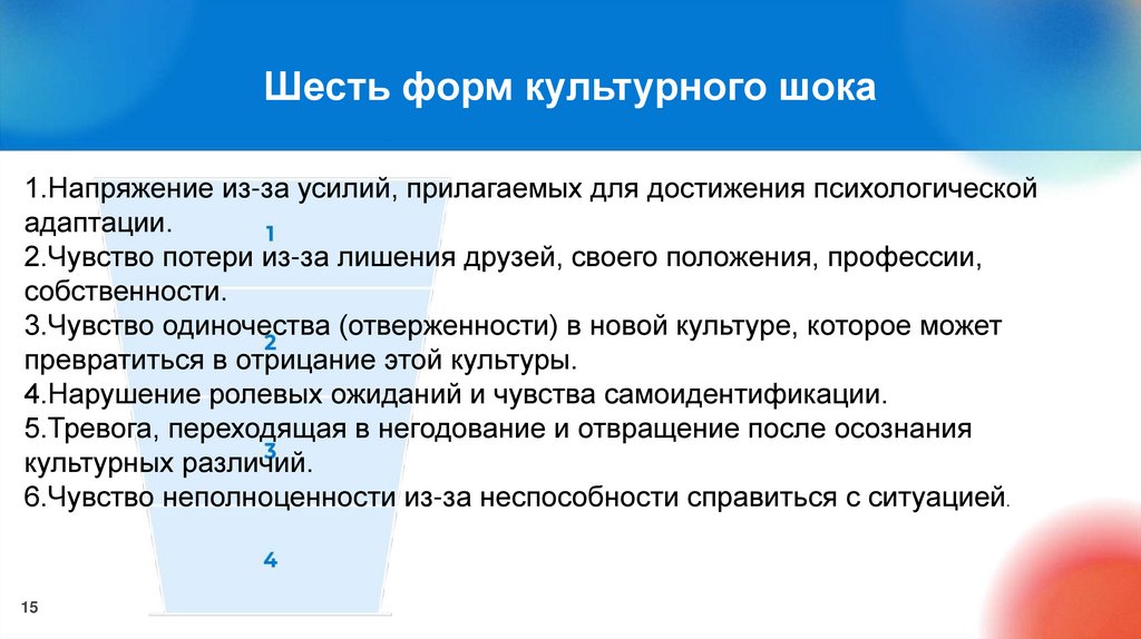 Шесть форм культурного шока1.Напряжение из-за усилий, прилагаемых для достижения психологической