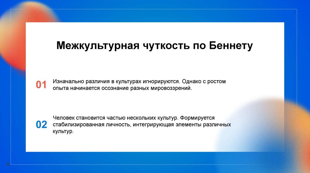 Межкультурная чуткость по БеннетуИзначально различия в культурах игнорируются. Однако с ростом