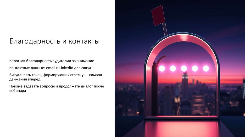 Благодарность и контактыКороткая благодарность аудитории за внимание