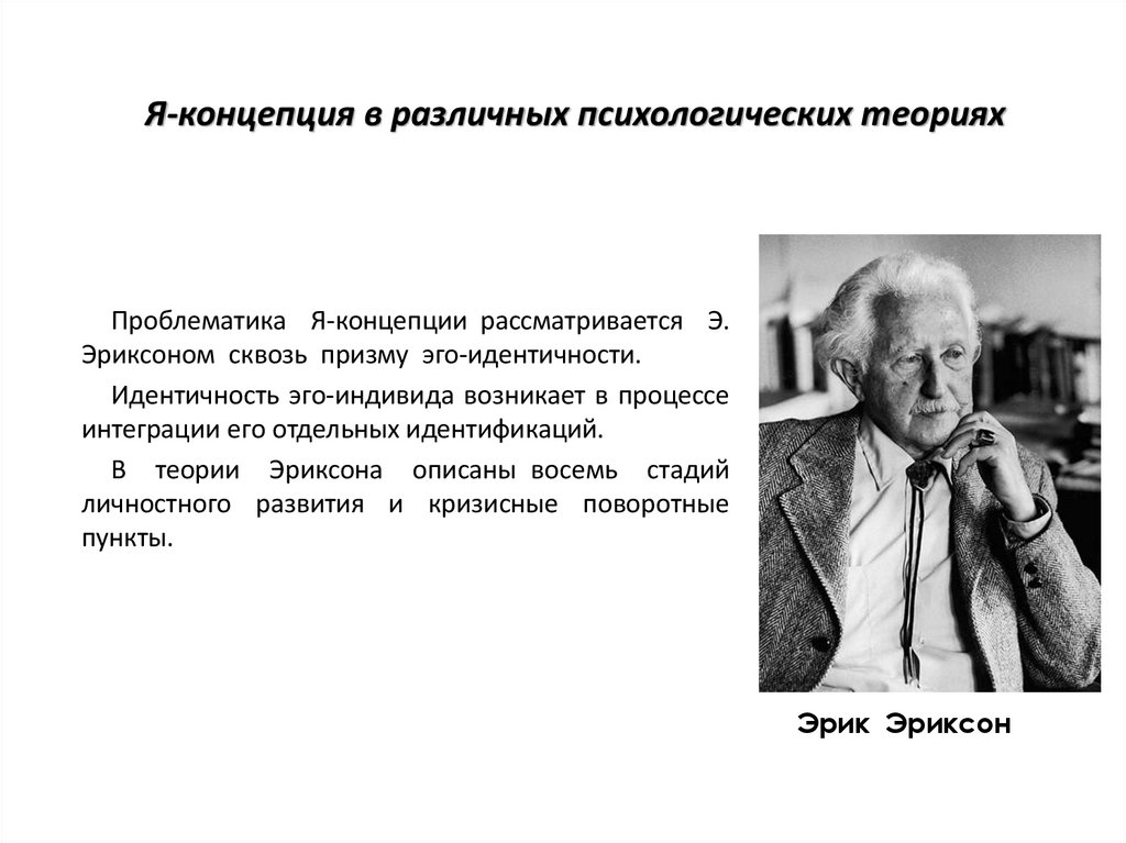 Проблематика Я-концепции рассматривается Э.Эриксоном сквозь призму эго-идентичности.