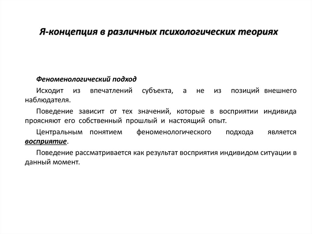 Феноменологический подходИсходит из впечатлений субъекта, а не из позиций внешнего