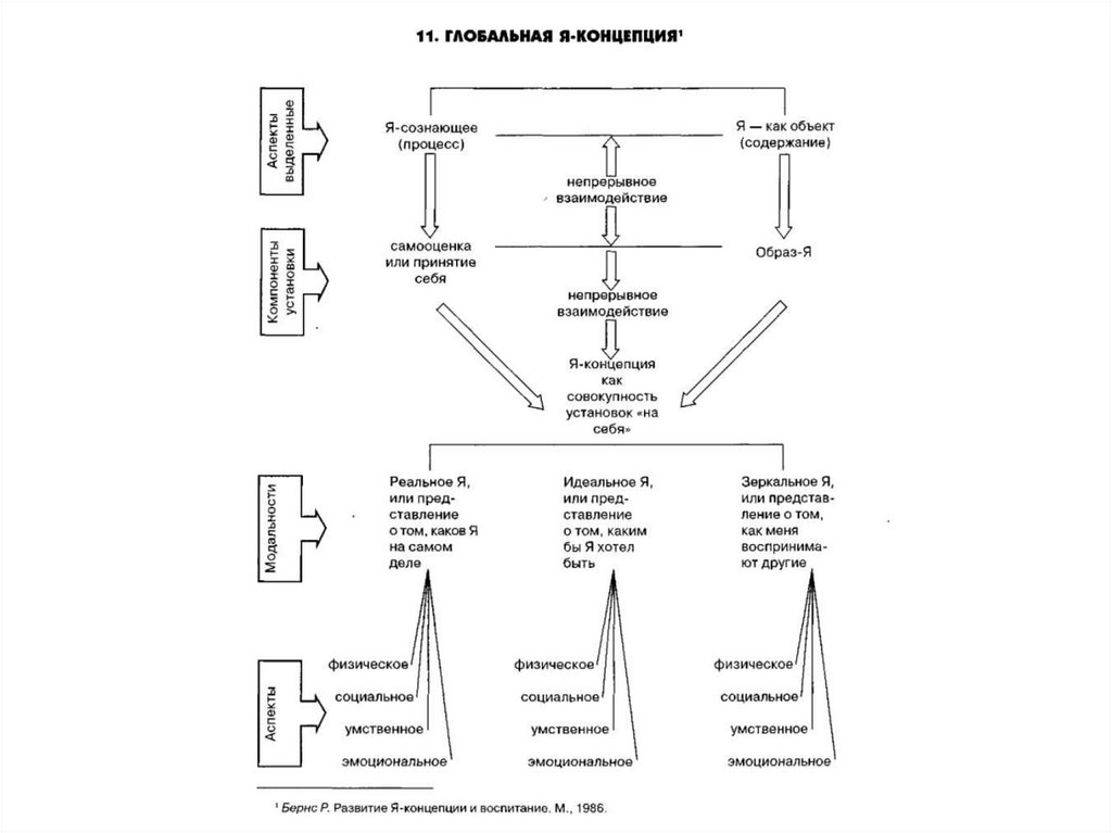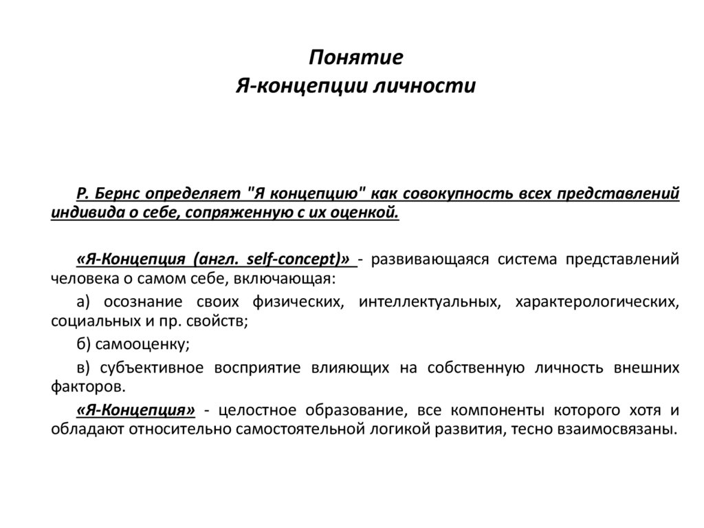 Р. Бернс определяет "Я концепцию" как совокупность всех представленийиндивида о себе, сопряженную с их оценкой.