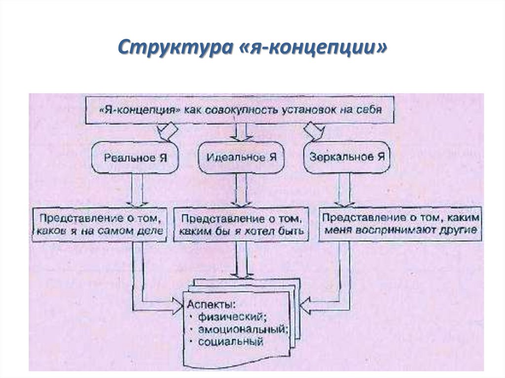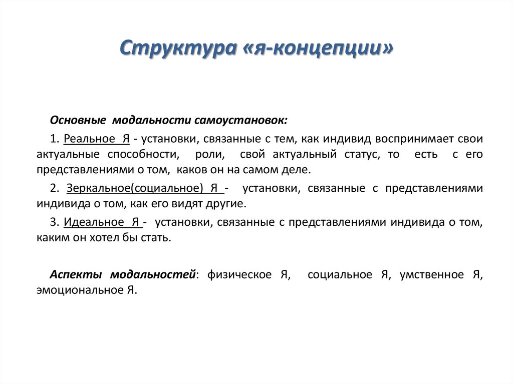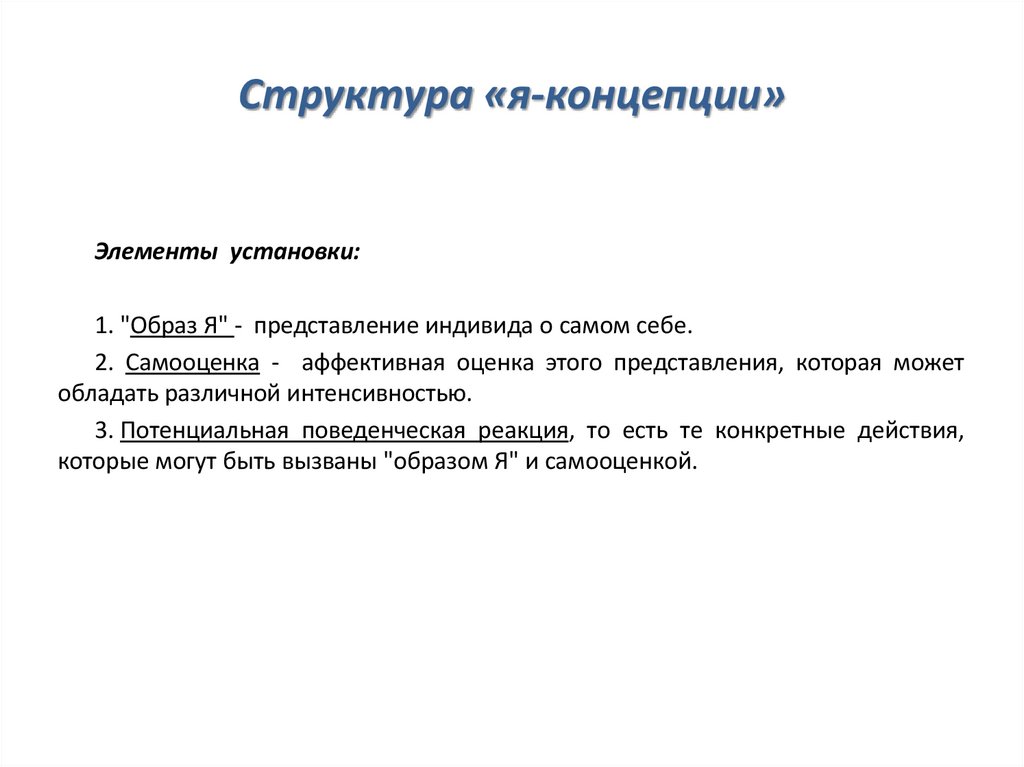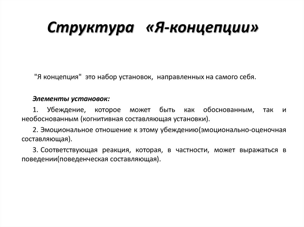 "Я концепция" это набор установок, направленных на самого себя.Элементы установок:
