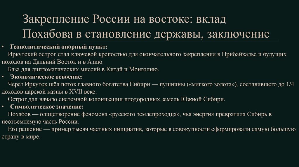5. Закрепление России на востоке: вклад Похабова в становление державы, заключение