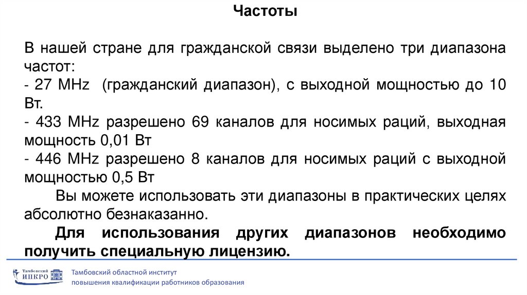- 27 MHz (гражданский диапазон), с выходной мощностью до 10