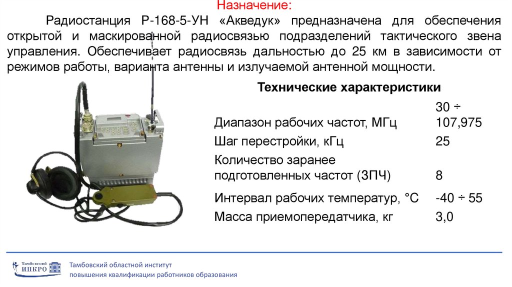 Назначение:Радиостанция Р-168-5-УН «Акведук» предназначена для обеспечения