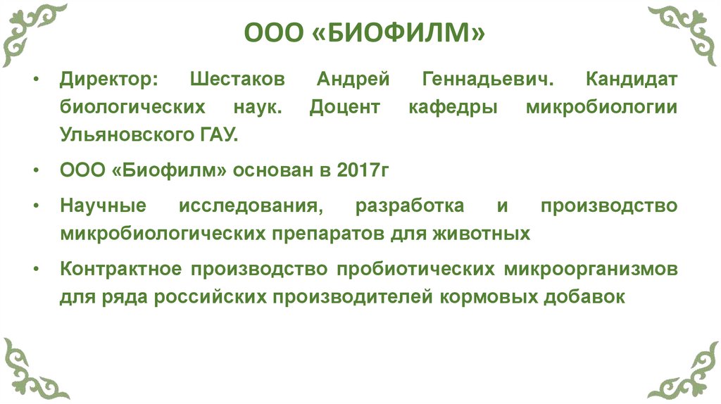 1. ИННОВАЦИОННАЯ ЛИНЕЙКА ПРОБИОТИКОВ ДЛЯ ЖИВОТНЫХ ПРОИЗВОДСТВА ООО «БИОФИЛМ»