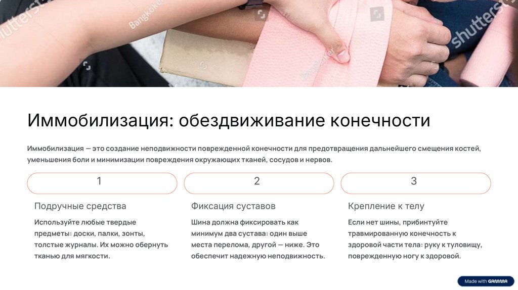 Иммобилизация: обездвиживание конечностиИммобилизация — это создание неподвижности поврежденной конечности для предотвращения дальнейшего смещения костей,