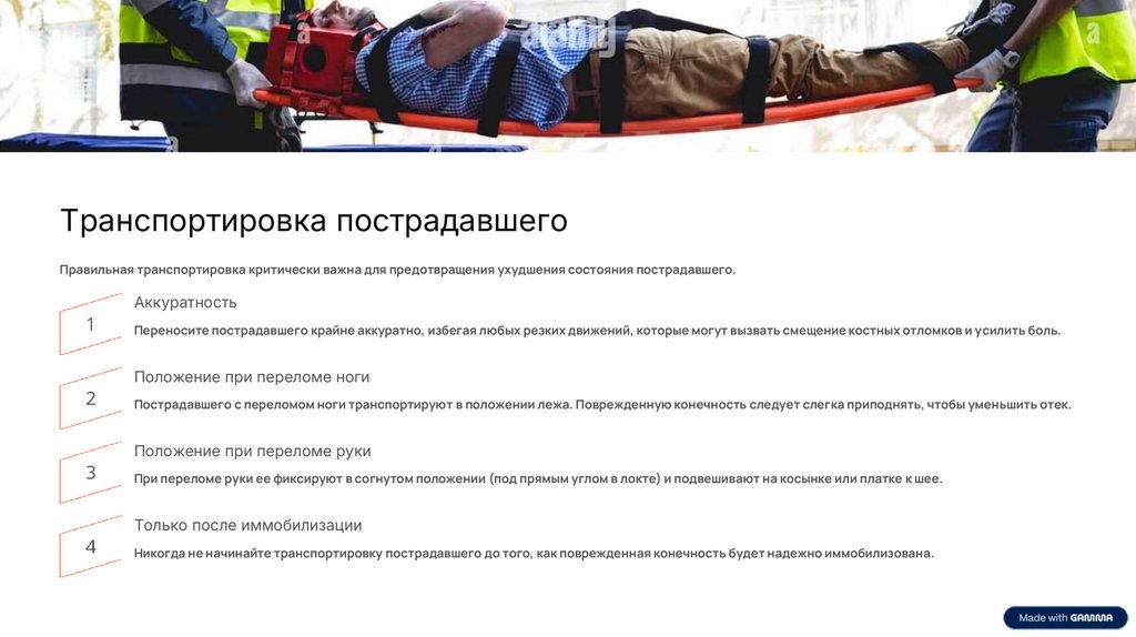 Транспортировка пострадавшегоПравильная транспортировка критически важна для предотвращения ухудшения состояния пострадавшего.