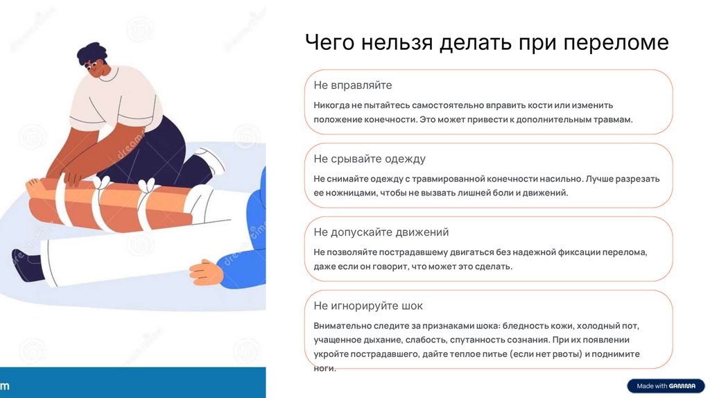 Не позволяйте пострадавшему двигаться без надежной фиксации перелома,
