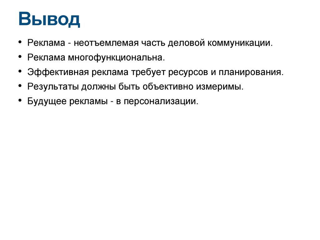Вывод• Реклама - неотъемлемая часть деловой коммуникации.