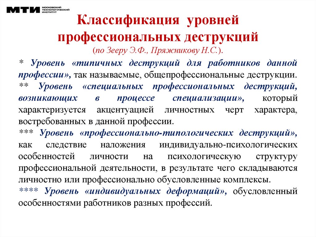 * Уровень «типичных деструкций для работников даннойпрофессии», так называемые, общепрофессиональные деструкции.