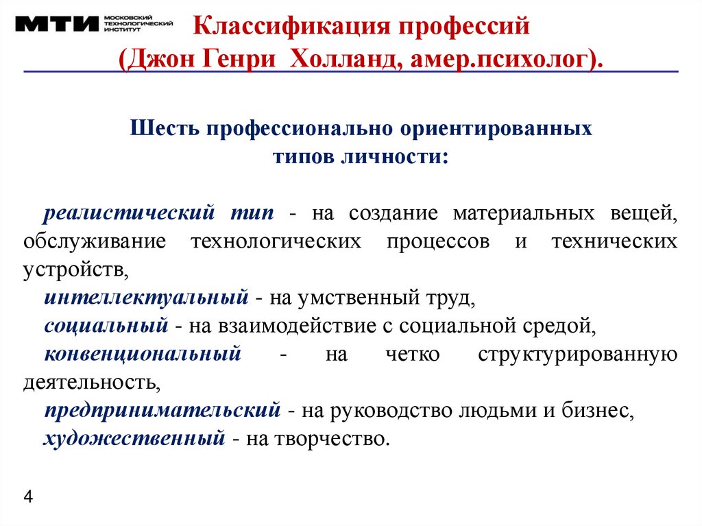 Классификация профессий(Джон Генри Холланд, амер.психолог).