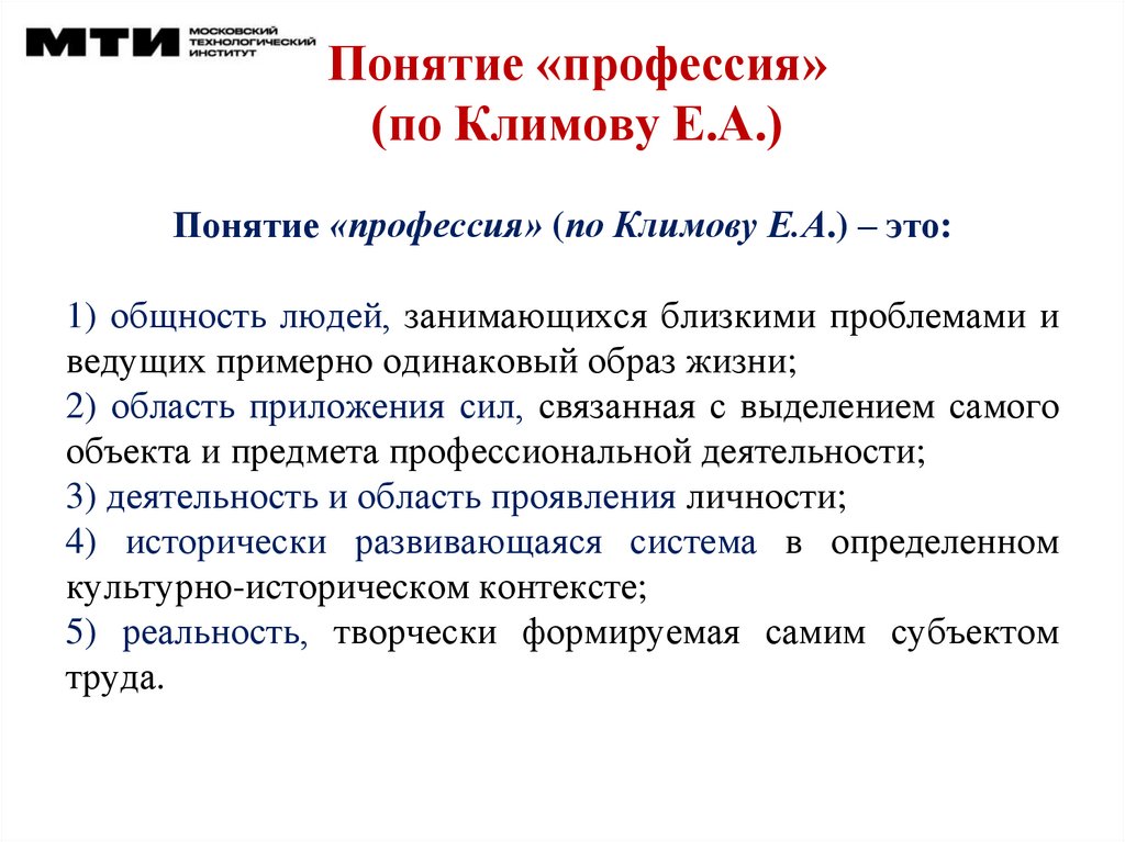 Понятие «профессия» (по Климову Е.А.) – это:1) общность людей, занимающихся близкими проблемами и