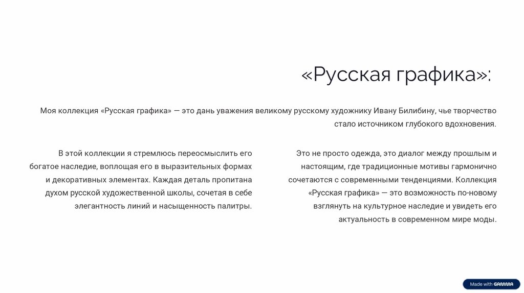 «Русская графика»:Моя коллекция «Русская графика» — это дань уважения великому русскому художнику Ивану Билибину, чье творчество