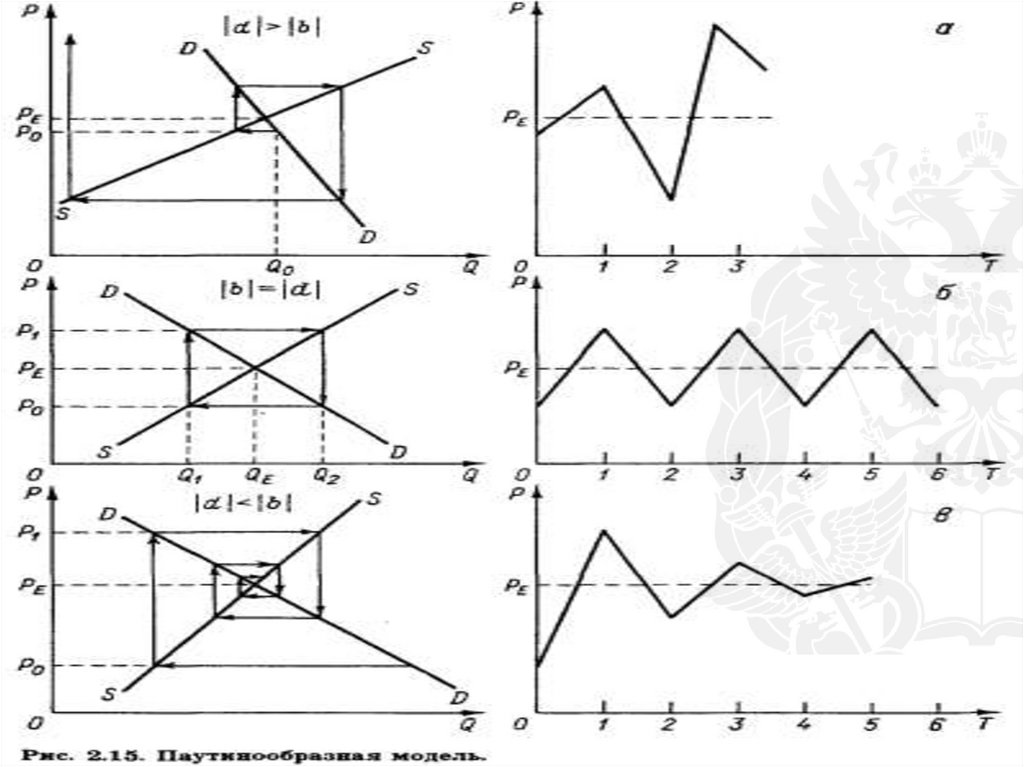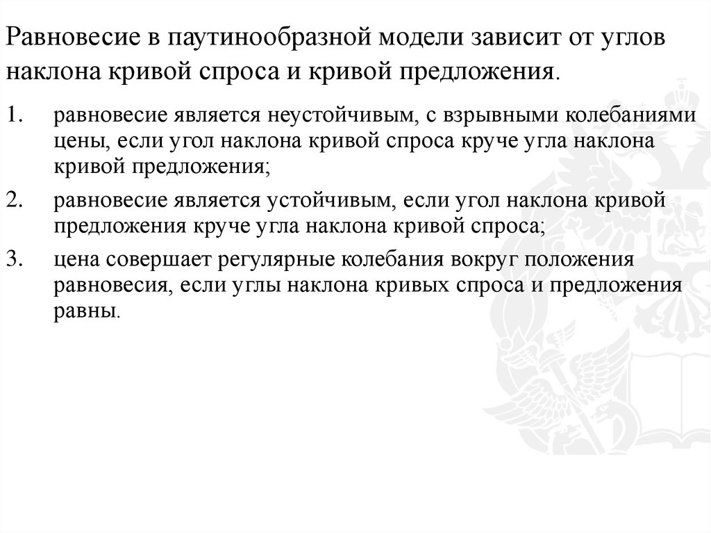 37. Равновесие в паутинообразной модели зависит от углов наклона кривой спроса и кривой предложения.