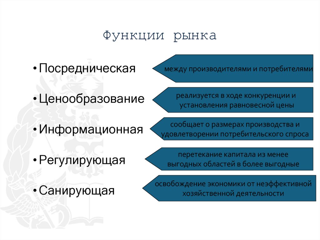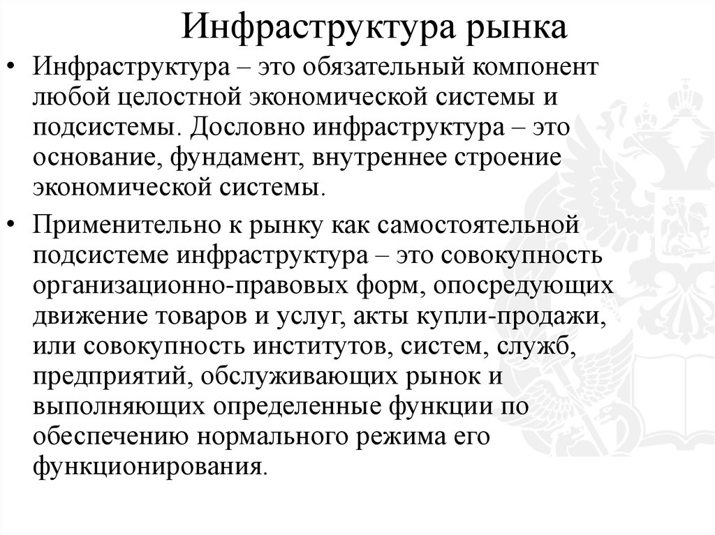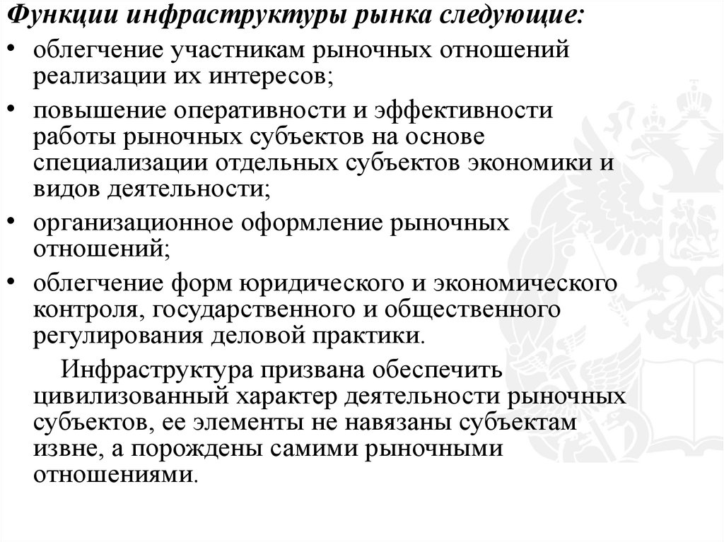 Функции инфраструктуры рынка следующие:• облегчение участникам рыночных отношений