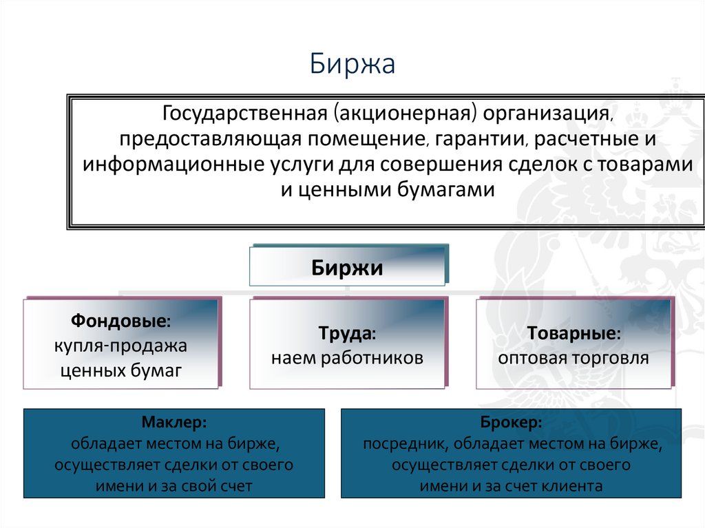 биржи (товарные, сырьевые, фондовые, валютные), их организационно оформленное