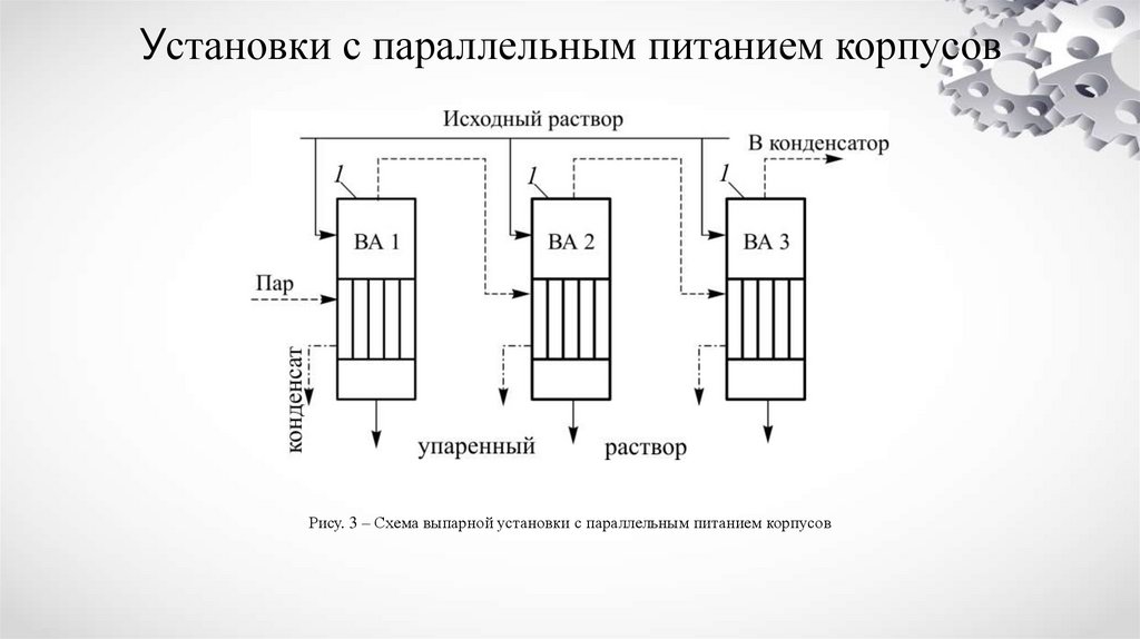 В выпарных установках с параллельным питанием раствор в каждом корпусе выпаривается до