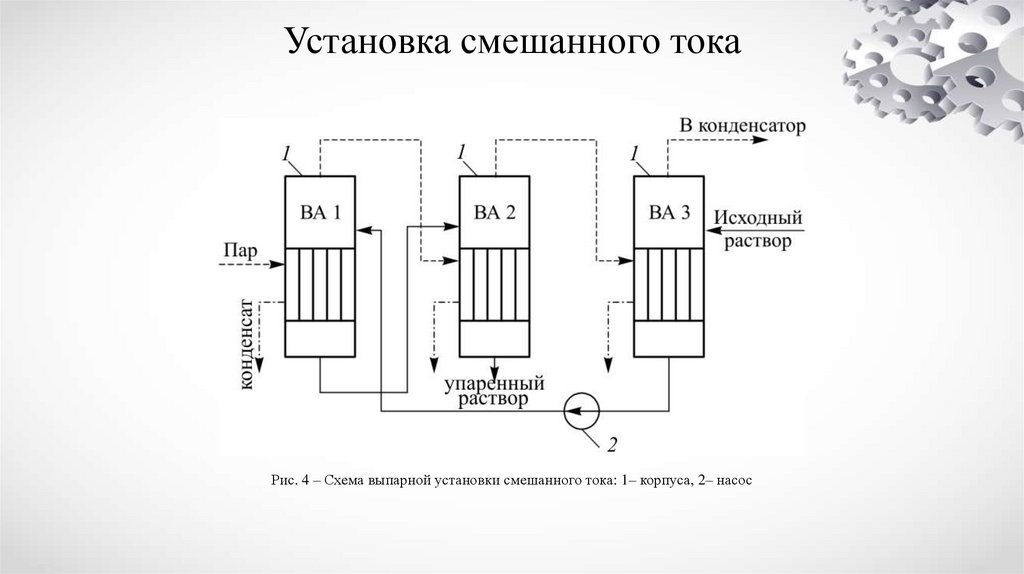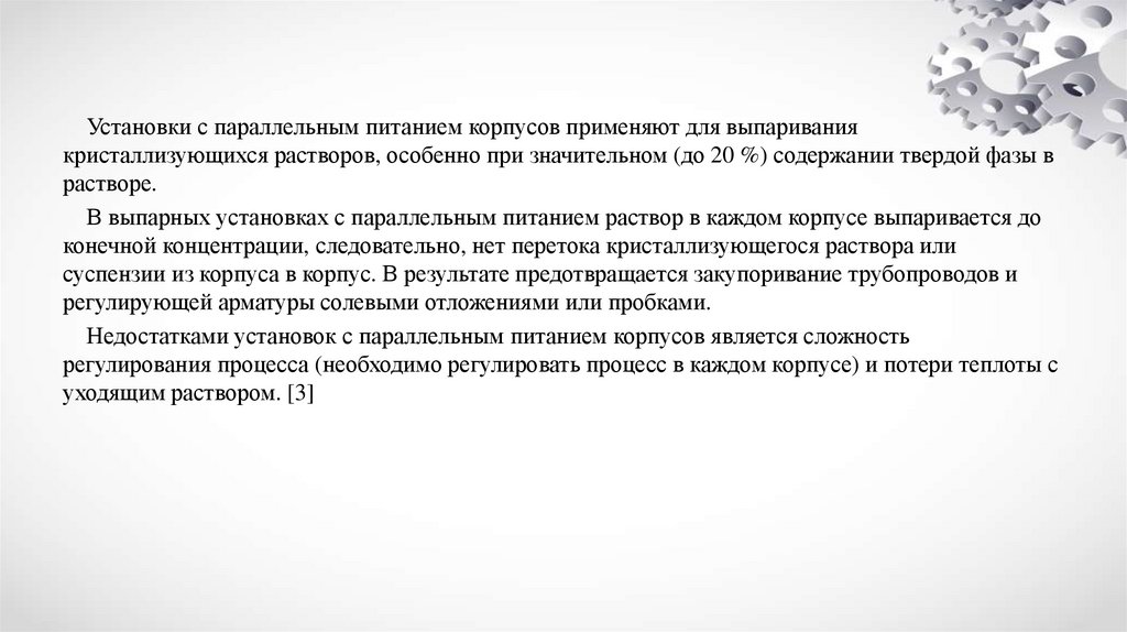 Установки с параллельным питанием корпусов применяют для выпариваниякристаллизующихся растворов, особенно при значительном (до 20 %) содержании твердой фазы в