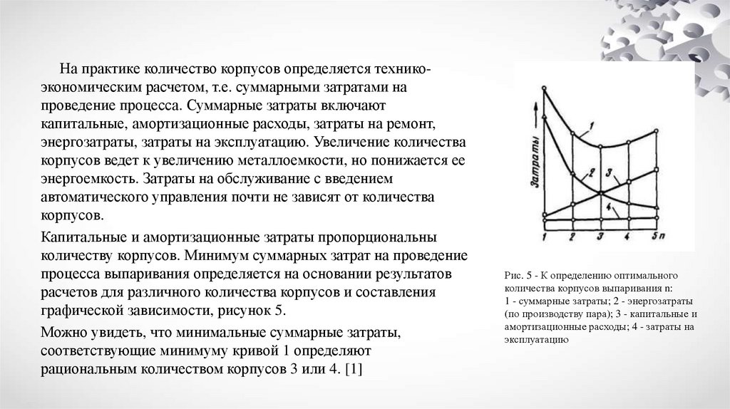 На практике количество корпусов определяется техникоэкономическим расчетом, т.е. суммарными затратами напроведение процесса. Суммарные затраты включают