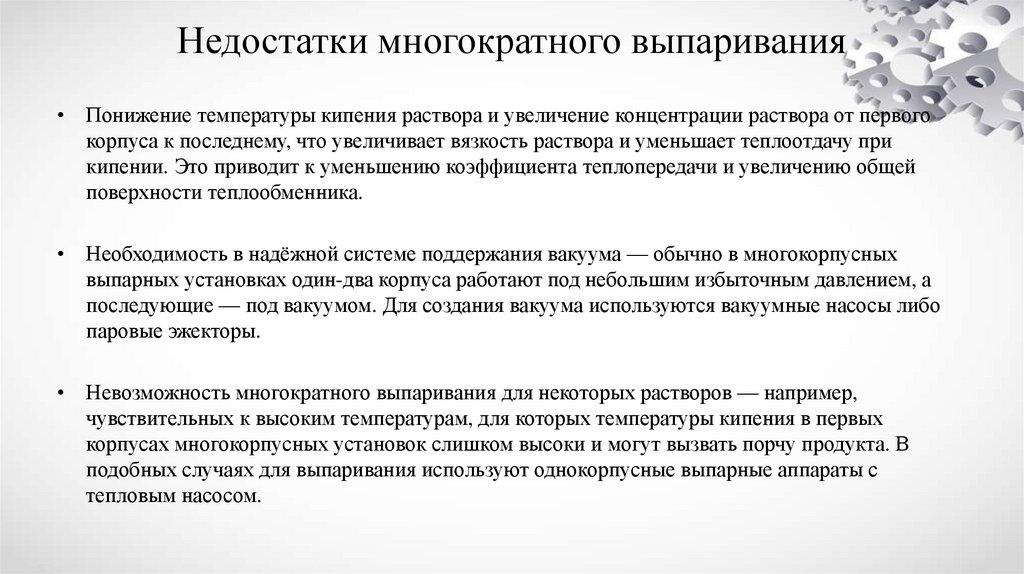 Недостатки многократного выпаривания• Понижение температуры кипения раствора и увеличение концентрации раствора от первого