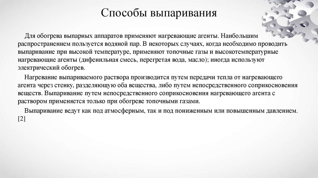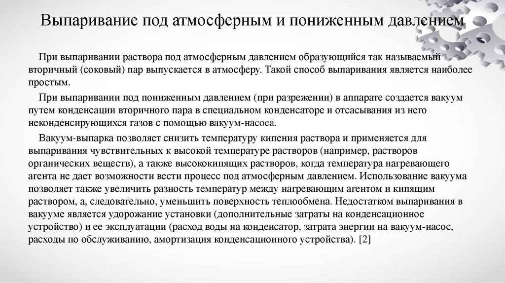 Выпаривание ведут как под атмосферным, так и под пониженным или повышенным давлением.