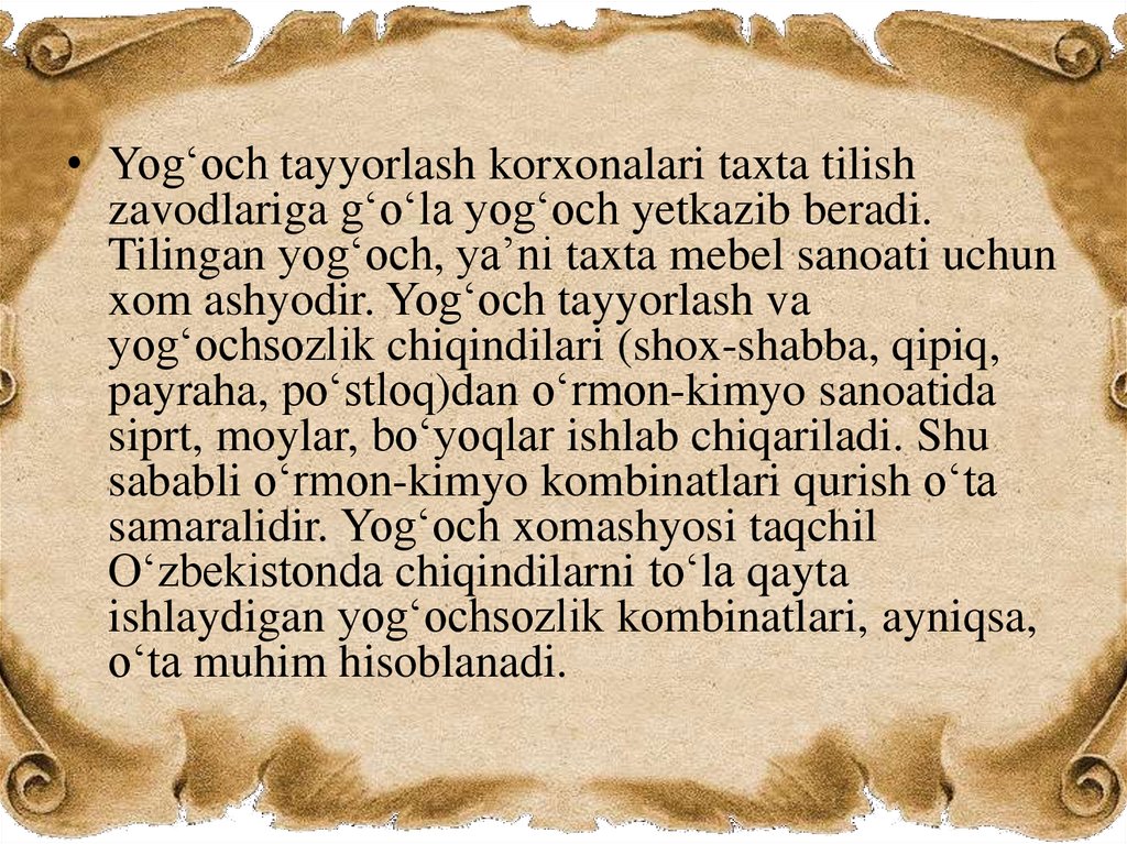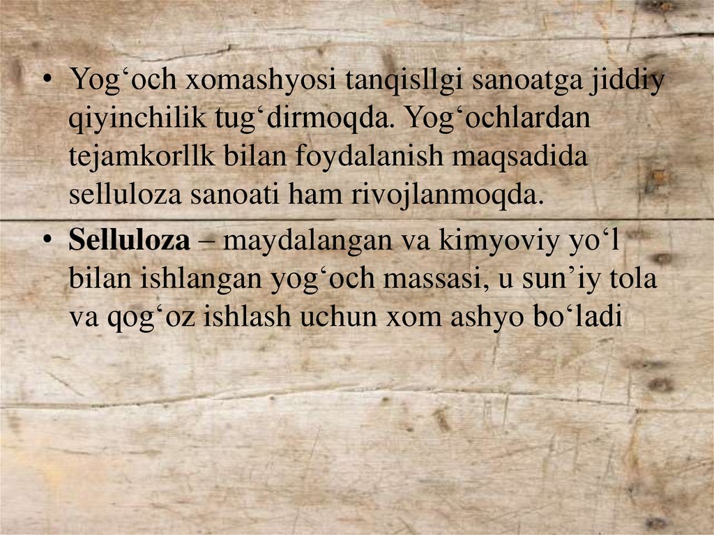 • Yog‘och xomashyosi tanqisllgi sanoatga jiddiyqiyinchilik tug‘dirmoqda. Yog‘ochlardan