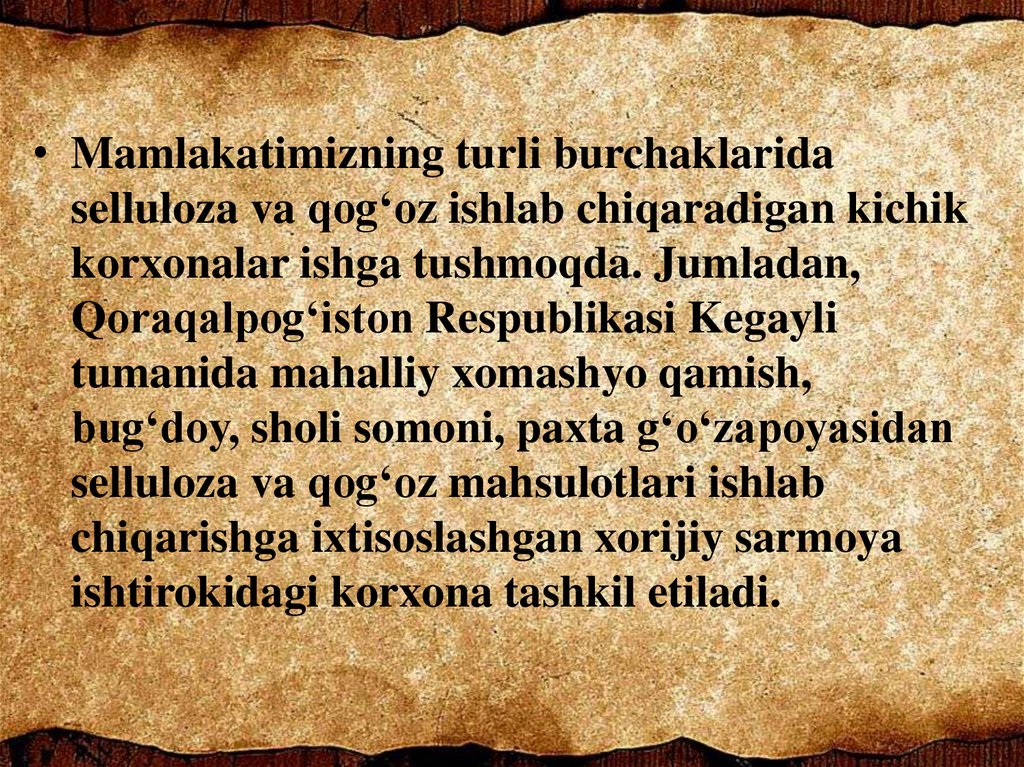 • Mamlakatimizning turli burchaklaridaselluloza va qog‘oz ishlab chiqaradigan kichik