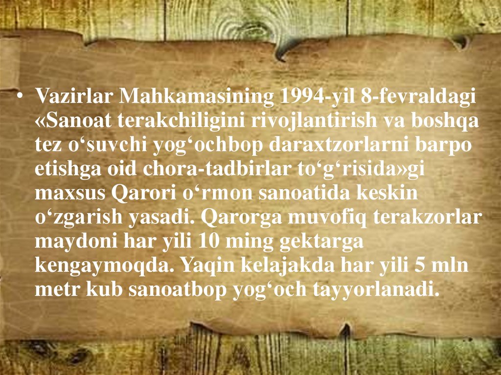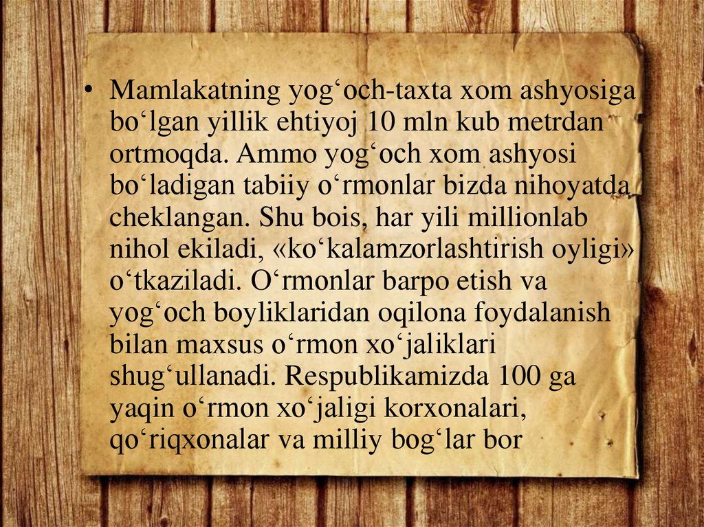 • Mamlakatning yog‘och-taxta xom ashyosigabo‘lgan yillik ehtiyoj 10 mln kub metrdan
