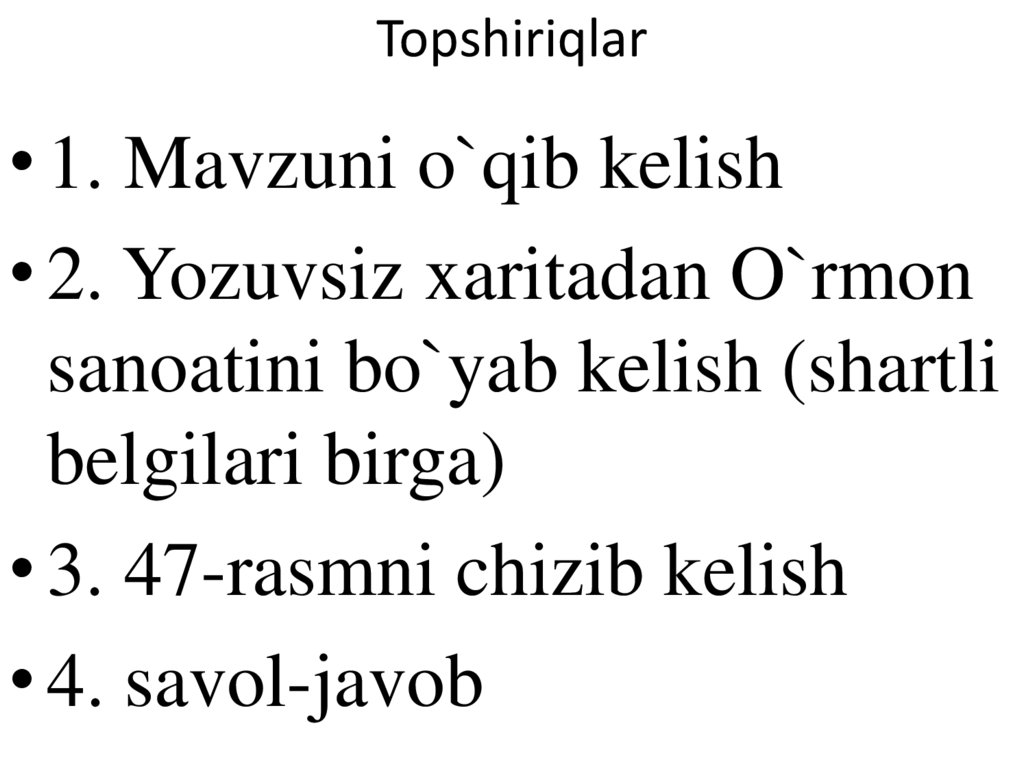 • 1. Mavzuni o`qib kelish• 2. Yozuvsiz xaritadan O`rmon